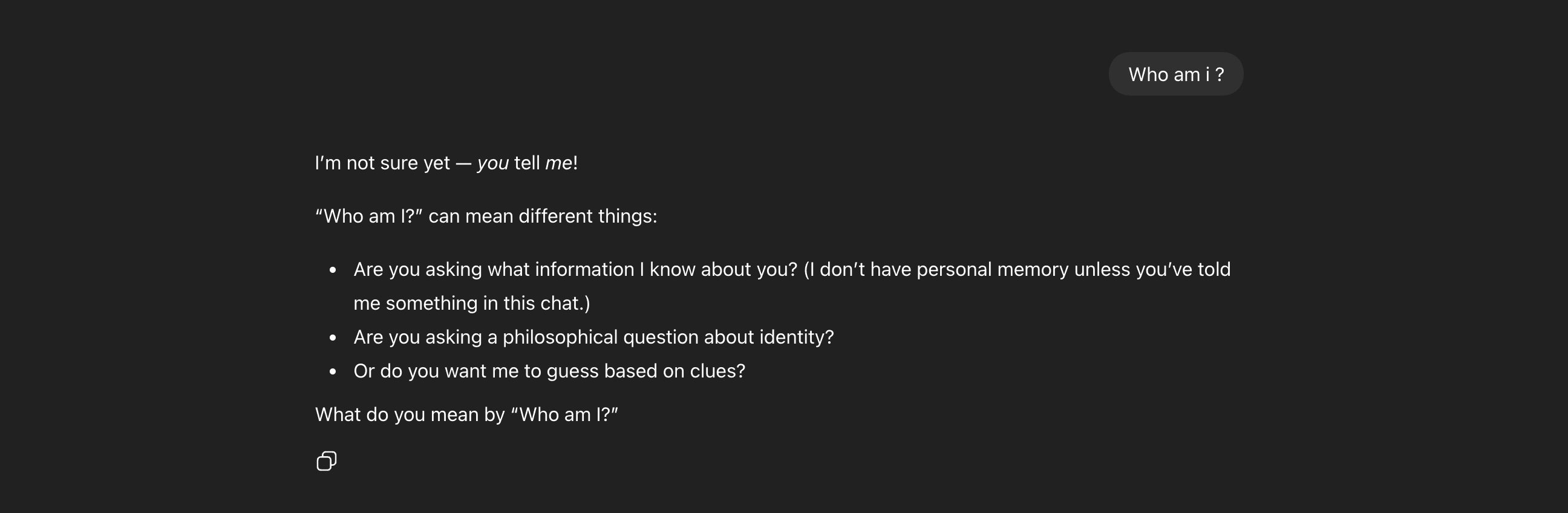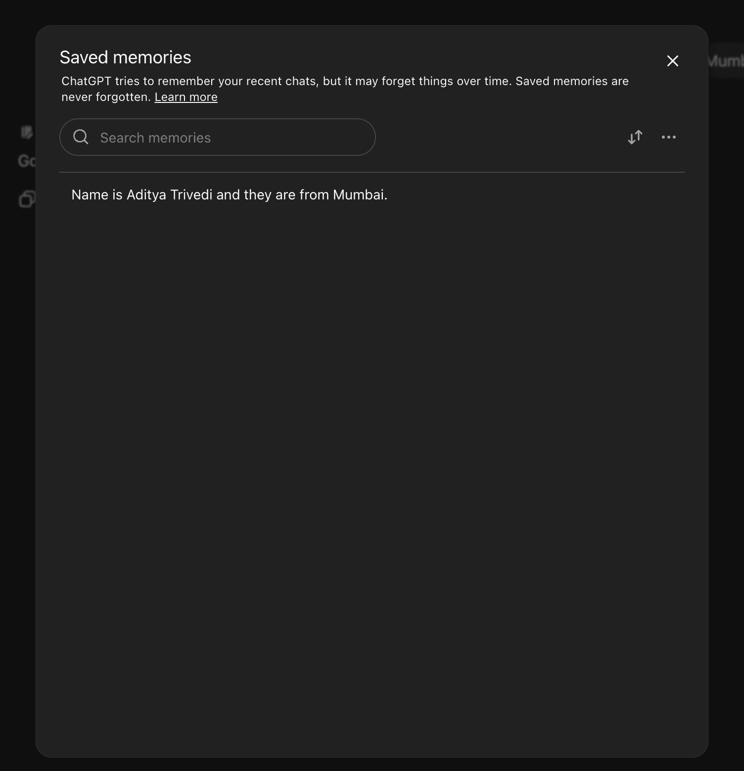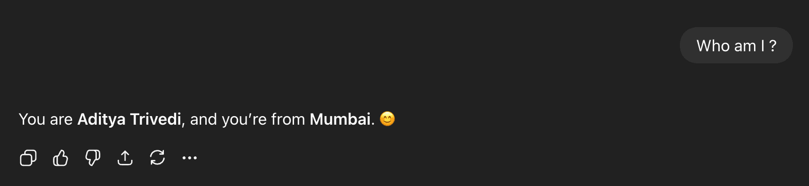 I created a fresh new account on ChatGPT and asked it Who am I ? The answer that I got is ‘I’m not sure yet - you tell me!‘. This means that it does not have any context or memory initially of who I am . Now, the next thing I tell it is to remember that ‘My name is Aditya Trivedi and I am from Mumbai’.