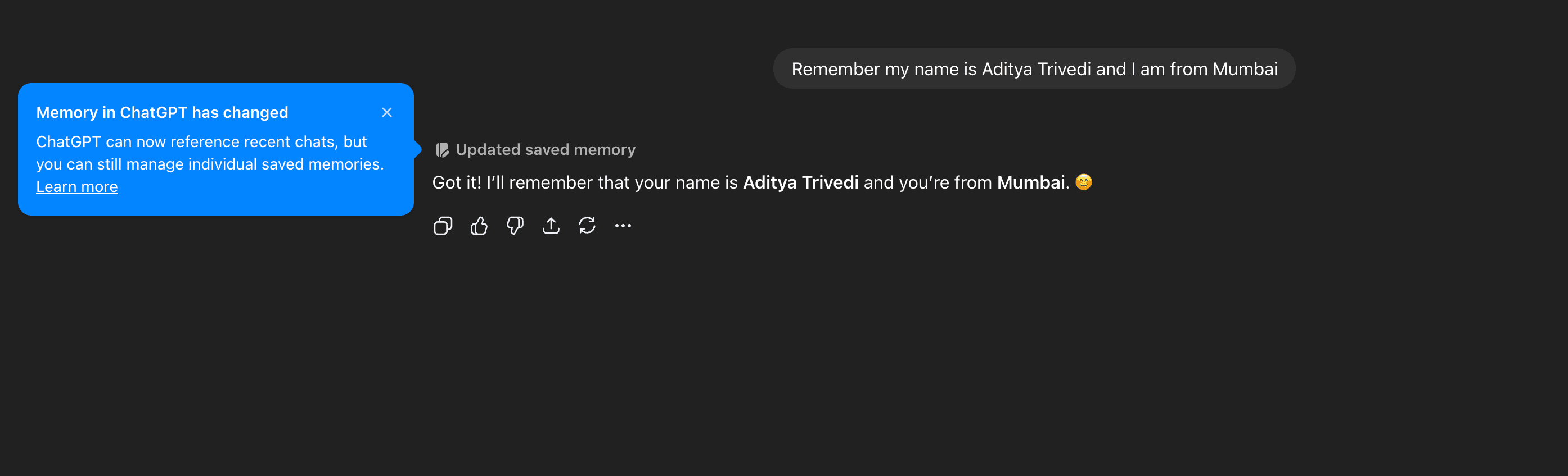 What do we see from the image above ? We get that Memory in ChatGPT has changed meaning now the AI has a memory of who I am and where do I live. It also tries to remember your recent chats but may forget over time.