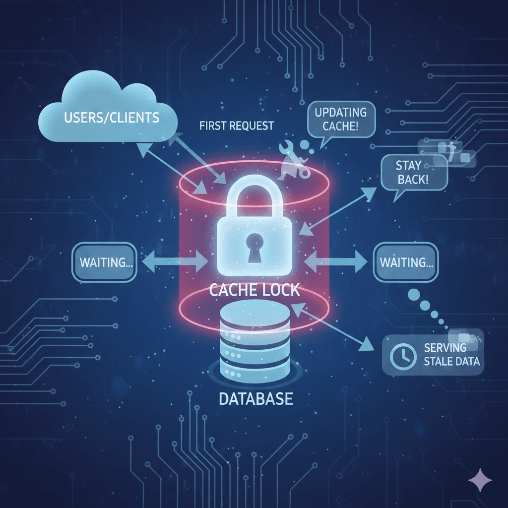 When the cache expires, the first request to arrive "grabs a lock". It tells the system, "I am currently updating the cache! Nobody else go to the Database." Other requests see the lock and either wait or server slightly "stale" (old) data for a few more seconds.